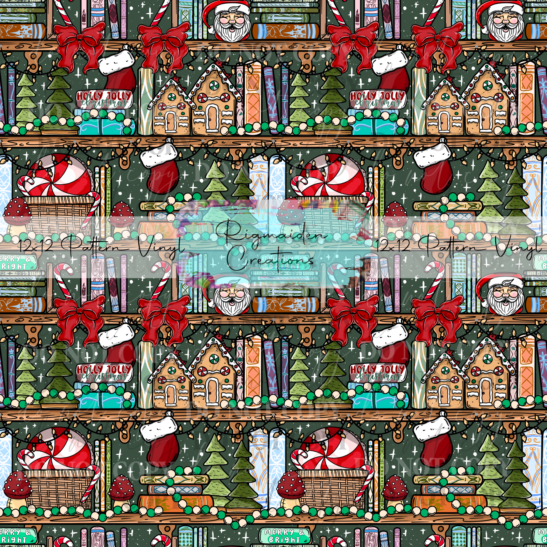 Green color background Christmas bookshelf featuring stockings, gingerbread, and more, perfect for a background on your tumblers or an accent to your glitter.