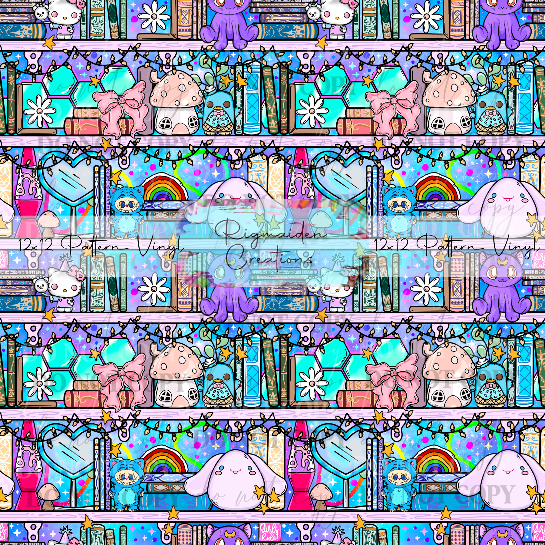 Bright girly bookshelf featuring Sanrio, squishes, and more, perfect for a background on your tumblers or an accent to your glitter.