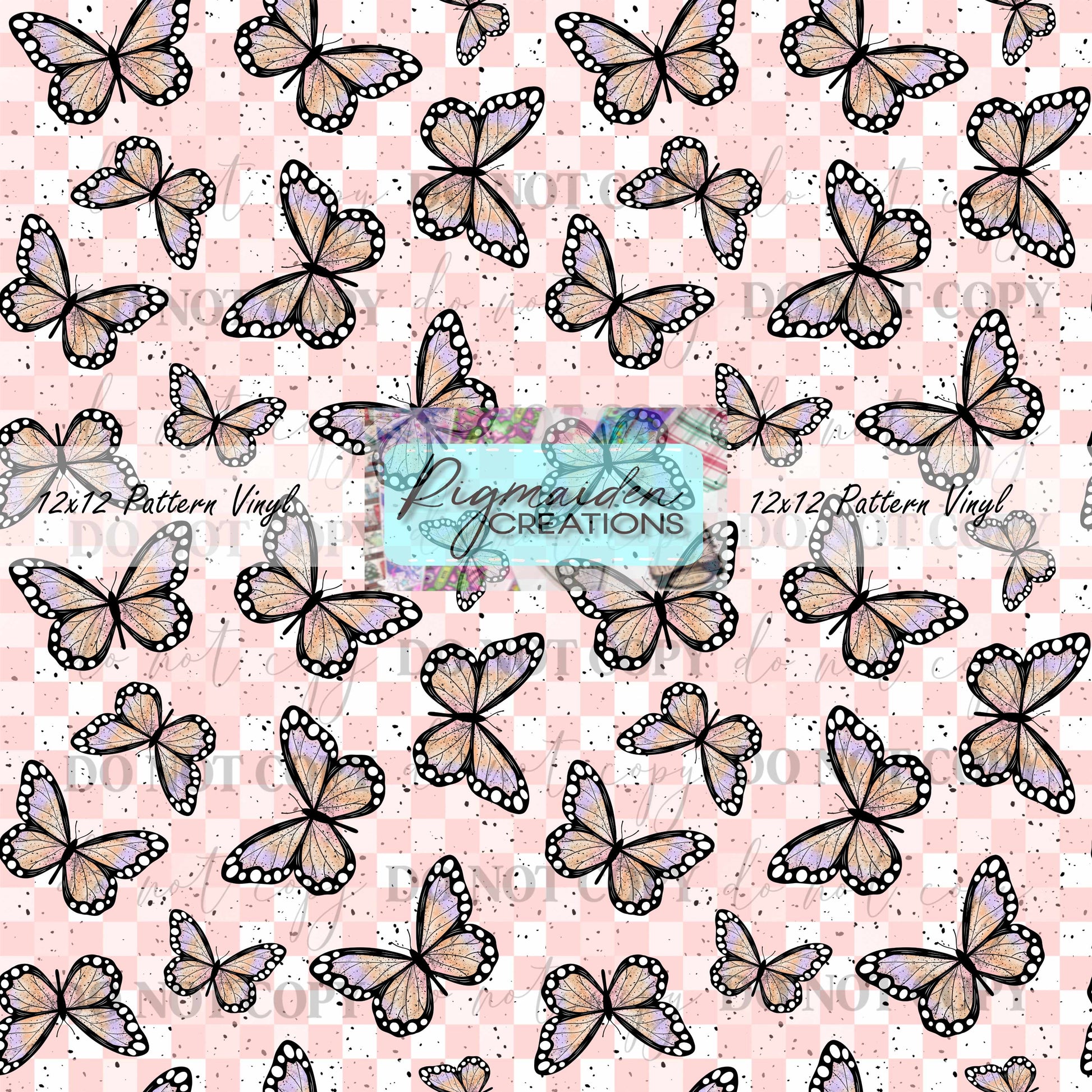 Monarch butterflies on a pink checkered background printed on vinyl available in multiple options for sizes and type of vinyl.